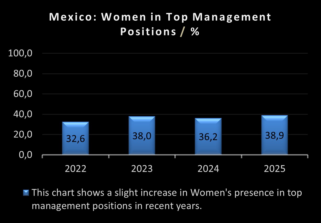 Laut einer aktuellen Studie „Women in Business“ liegt der Anteil von Frauen in Führungspositionen derzeit bei 38,9 %, ein leichter Anstieg gegenüber 36,2 % im Vorjahr und in etwa gleich hoch wie im Jahr 2023. Quellen: Grant Thornton Mexiko, El Economista Mexiko